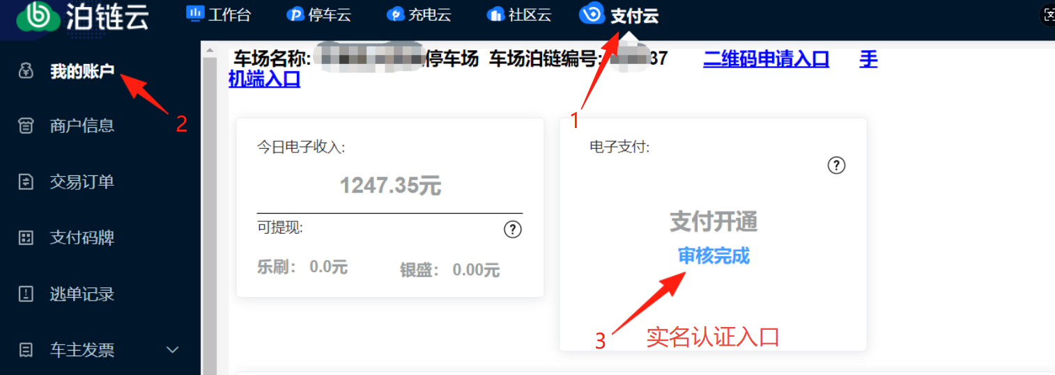 2024年1月1日 ### 一、概述 实名认证一共分为2个主要步骤 1.提交实名认证信息 2.商户授权 下面详细叙述各步骤操作方法。 ## 二、提交实名认证信息   支持填写法人或联系人信息,==如法人不方便进行后续扫码授权步骤,“联系人类型”请选择“联系人”。== 所需资料如下: 备注:如果没有真实车场收费牌,企业需要传相关停车资质,个人可以传车场入口照。 | 主体类型 | 联系人类型:法人/经营者 | 联系人类型:联系人 | | --- | --- | --- | | 企业/个体户 | 法人居住地址(身份证上的)、法人手机号、车场收费牌(真实收费告示牌) | 联系人姓名、手机号、身份证正反面、身份证号、业务办理授权函、车场收费牌(真实收费告示牌) | | 事业单位| 法人居住地址(身份证上的)、法人手机号、车场收费牌(真实收费告示牌)、单位证明函 |联系人姓名、手机号、身份证正反面、身份证号、业务办理授权函、车场收费牌(真实收费告示牌)、单位证明函 | | 社会组织 |法人居住地址(身份证上的)、法人手机号、车场收费牌(真实收费告示牌) |联系人姓名、手机号、身份证正反面、身份证号、业务办理授权函、车场收费牌(真实收费告示牌) | | 政府机关 | 法人居住地址(身份证上的)、法人手机号、车场收费牌(真实收费告示牌) | 联系人姓名、手机号、身份证正反面、身份证号、业务办理授权函、法人代表说明函 、车场收费牌(真实收费告示牌)| | 个人商户 |车场收费牌(真实收费告示牌) | / | 资料说明:文字类的都在车场认证页面可以下载。 1.车场收费牌 含车场名称、计费规则的指示牌。图片大小不超过1M。示例如下:  2.业务办理授权函 请打印好后盖公章,勿手写,上传图片大小不超过1M。 [【附件】业务办理授权函 - 模板.doc](/media/attachment/2024/01/%E4%B8%9A%E5%8A%A1%E5%8A%9E%E7%90%86%E6%8E%88%E6%9D%83%E5%87%BD_-_%E6%A8%A1%E6%9D%BF.doc) 3.事业单位单位证明函 请打印好后盖公章,勿手写,上传图片大小不超过1M。 [【附件】事业单位单位证明函.docx](/media/attachment/2024/01/%E4%BA%8B%E4%B8%9A%E5%8D%95%E4%BD%8D%E5%8D%95%E4%BD%8D%E8%AF%81%E6%98%8E%E5%87%BD.docx) 4.政府机关法人代表说明函 请打印好后盖公章,勿手写,上传图片大小不超过1M。 [【附件】法定代表人说明函.doc](/media/attachment/2024/01/%E6%B3%95%E5%AE%9A%E4%BB%A3%E8%A1%A8%E4%BA%BA%E8%AF%B4%E6%98%8E%E5%87%BD.doc) ## 三、商户授权(微信、支付宝) 实名认证信息提交成功后,需要法人/联系人分别在微信/支付宝授权。 目前有3种方式,第一种是登录车场后台扫码(推荐),第二种是通过手机短信扫码操作,第三种是自助扫描渠道拓展码(仅适用于法人扫码)。 #### 方式一:车场后台获取二维码认证(推荐) 1.微信 点击微信-认证状态-待验证,弹出以下二维码,请联系人/法人扫码。  不同类型商家的认证方式不一样,个人、企业、个体户一般扫码即可,其他组织需要汇款验证   需要汇款验证的操作如下,选择汇款到银行账户,后续在“微信支付商家助手”小程序/公众号中关注进展。  2.支付宝 点击支付宝-认证状态-审核失败,弹出以下二维码,请联系人/法人扫码。   #### #### 方式二:短信获取二维码认证 1.微信 (1)联系人收到短信, (2)联系人用已经实名认证的微信扫描“信息确认二维码”,确认商家资料完成注册,待微信审核通过后,将“商家身份验证二维码”发送给法人授权; (3)法人用已经实名认证的微信扫描“商家身份验证二维码”,点击确认商户号授权联系人的微信绑定商家资料; (4)联系人收到「微信支付商家助手」小程序推送的模版消息“商家注册进展通知”,点击继续完成最后的门店商户号授权。   2.支付宝 (1)联系人用已经实名认证的支付宝账号扫描“信息确认二维码”并接收验证码后,选择法人确认方式,将“商家身份验证二维码”发送给法人授权或通过支付宝发送消息通知法人; (2)法人完成信息确认; (3)扫码确认:选择此确认方式后,法人用已经实名认证的支付宝账号扫描“商家身份验证二维码”,点击确认商户号授权联系人的支付宝绑定商家资料; (4)支付宝消息确认:选择此方式后,支付宝将尝试推送一条确认消息至法人已经实名认证的支付宝账号,法人可通过【支付宝首页-消息盒子】查看并完成授权,每天可推送一次消息,最多五次; (5)法人完成确认后,联系人重新扫描认证二维码,或支付宝搜索【支付宝商家认证助手】进入商家注册页面,点击“去核实”并选择当前服务商名下的收款账号完成商户号授权 #### 方式三:自助扫描渠道拓展码(仅适用于==法人扫码==) 1.微信 商家法人扫描服务商拓展二维码进入小程序,按指引提交商家联系人信息、营业执照照片、法人/经营者身份证照片,并进行主体身份验证。  (1.1)商户法人提交商户资料 选择商家主体类型(若商家已经核实商家身份,可直接跳到第3步进行核实收款商户号)  请提前准备商家主体类型所需资料,以便后续填写及上传  (1.2)填写联系信息,填写商户资料  无需等待资料审核通过和身份验证完毕,提交资料后可立即核实收款商户号 (1.3)查找商户号、核实收款商户号 若不知道自己的商户号,可直接联系我司人员获取。  (1.3.1)“知道”自己的商户号  (1.3.2) “不知道”自己的商户号   2.支付宝 商家法人扫描服务商拓展二维码进入小程序,按指引提交商家联系人信息、营业执照照片、法人/经营者身份证照片,并进行主体身份验证。 【小微商户】扫码-前