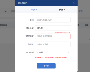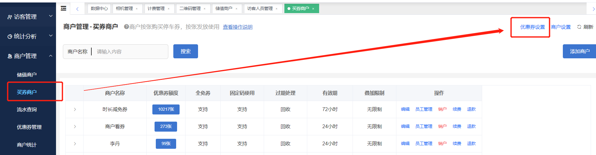 ###### 1.1买券商户页面添加  ###### 1.2新增商户设置  **商户名称**:填写商户的名称 **优惠券类型**:分为时长定额减免,金额定额减免,折扣减免。 **时长定额减免**:按照停车时间发放固定额度的优惠券,减免单位为天,小时,分钟; **金额定额减免**:按照停车金额发放固定金额的优惠券,减免单位为元; **折扣减免**:按照停车费的指定折扣减免的优惠券,例如折扣为7折,用券后订单应缴费金额为实际 产生费用的7折来计算 **全免券**:默认支持 **默认显示额度**:按照停车场需求填写默认显示额度:当商铺发优惠券给车主的时候,有快捷按钮,按钮的数值 就是在此处设置,可以修改。 **手输额度**:如果想给车主发的优惠券的额度不是默认额度,需要手动填写,此处选择支持。 **全免每张/元**:停车场给店铺发全免券,每张券的售价。 **全免券使用限制**:单次有效,多次有效,按照车场要求填写,默认单次有效。 注:多次有效指的是商户发全免券时,输入有效时间(如5小时),选择多次有效,则用券时下发给车场 收费系统指定参数,系统在处理时,对于该车牌在指定的5小时内多次进出产生的多个订单都适用该减免。 一般适用于酒店入住的车辆减免。 设置完成,点击“确定”按钮。 **有效期**:默认24小时,表示优惠券生成之后,24小时内有效,车主可以扫码使用,超过24小时,优惠 券过期失效,无法减免,过期券会在第二天凌晨1点回收额度到商户额度,避免商户额度的浪费,也可以设置不回收 **叠加限制**:车主在停车场的多个店铺都有可能获取到优惠券,是否支持叠加,或者设置最多叠加多少张。 (商户管理页面右上角设置的叠加用券是车场的限制,优先) **固定码使用**:默认支持(此处最好不修改) **承担费用:**默认是商户,可以设置成车主或者商户,这样可以设置车主买券 **自动发券**:每日0点自动给该商户续费若干指定优惠券,当天24点前未发出的券作废 每月1日0点自动给该商户续费若干指定优惠券,当月最后一天24点前未发出的额度作废 每月自动发券(累加下月): 每月1日0点自动给该商户续费若干指定优惠券,当月最后一天24点前未发出的额度自动累加到下一个月 **商户名称**:填写店铺名称 **地址信息**:酌情填写 **手机号码**:填写店铺管理员手机号码(很重要,用于密码找回) **商户折扣**: 默认100%(折扣100%情况,例如停车场给店铺发1000元的优惠券,需要店铺付款1000; 如果停车场给店铺发1000元的优惠券,需要店铺付款800元,折扣就设置为80%) **商户自助续费**:可以设置商户自行充值续费 **全免每张/元:**全免券价值多少元一张 设置完成,点击“确定”按钮。 ###### 1.4优惠券类型添加 **买券商户:**注册商户后,需在右上角的优惠券设置处,设置优惠券的类型、价格、额度等信息。  设置好优惠券信息后,可选择购买优惠券、全免券、设置商户优惠券的生效期等功能。 ###### 1.5续费 1. 添加优惠券完成之后就会产生一条记录如下图:点击“续费”按钮   **减免券:**(元):车场给商户批量发券总额 **全免券:**(张):车场费商户批量发全免券张数 **应收金额**:批量发券总金额 **当前折扣:**(%):折扣在前面添加商户的时候已经设置好 **实收金额:**(元):批量发券实际收款总金额,如上图,完成设置,点击“确定”按钮 **开始日期**:生效日期内该额度可用,没到开始日期无法使用 **结束日期**:过期额度作废 ###### 1.4查看商户登录账号 1. 点击“账号列表”按钮;  1. 平台自动生成默认超级管理员账号,账号密码一致  **2.1优惠券发放(商家发给车主)** **2.1商户小程序发放减免券:**商户在微信小程序页面搜索“运营小管家”,进入小程序,输入设置的员工账号、密码进行登录。  支持两种发放方式:车主扫码和商加主动输入车牌。   **2.2商户web后台发放减免券:**打开车场云平台登录地址(https://m.yima.world/login) , 输入设置的员工账号、密码进行登录。   同样支持车主扫码和商加主动输入车牌。并且减免券支持自动更新和导出打印。全免券支持多次有效,意思是一次扫码,车主可以在有效时间内多次进出车场。 **2.3商户固定码管理** 在大型会议期间,需使用大量相同额度的减免券,这种情况可以使用固定码,方便快 捷。打开固定码管理页面,点击“添加”,输入固定码的名称、减免类型(固定额 度或全免券),减免券需输入每张券的额度和张数,全免券则需输入张数 当日限制:每个车牌在一个自然日可扫码用券的张数限制,云端判断,默认无限制 **下一步非必填时间:** 起始、结束日期:在这段日期内可扫码领券,过期该固定码失效,不能继续扫码领 券,但不影响客户之前已领取的优惠券 **扫码时段:**在对应时段内可扫码领券,云端限制 **生效时段:**该时段下发给车场系统,由车场判断在这段时间内计算优惠 **定时刷新:**默认不刷新,可设置刷新频率,刷新后使用新的二维码,旧码失效;防 止固定码被客户拍照留下后恶意获取优惠券 **有效次数:**单次或多次,该参数下发给车场,车场判断领取一张券后在前面的生效 时段内是否对于多个订单多次生效 **费用承担:**商户或车主,普通情况是商户向车场购买优惠券后免费发放给车主;商 户也可以设置在车主扫码领券时需支付一定费用。  **固定码充值:**如果商户的固定码额度用完,不想更换固定码时,可以给该固定码充 值,继续使用。充值额度不大于商户剩余的当前可用额度。  在固定码的有效日期、