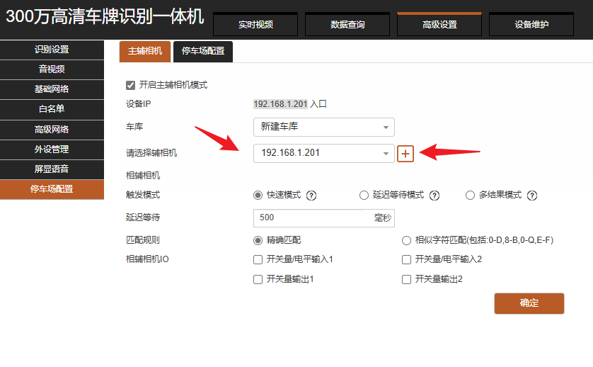 #### 辅助相机识别不抬杆一般出现在臻识C系列相机上,C系列的辅助相机需要在本地进相机后台设置辅助相机 1、在能访问相机ip的本地电脑上,网页输入两台相机ip访问后台,**主副相机都得登录** 2、进入主相机后台,高级设置->停车场配置,选择对应的辅助相机ip,再点右边加号,最后点击确认就配置成功了