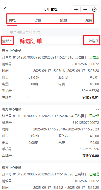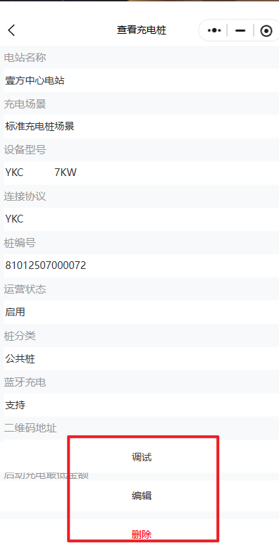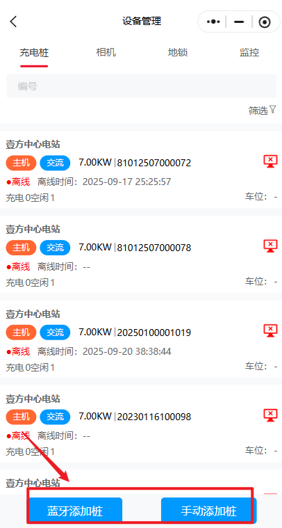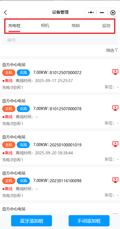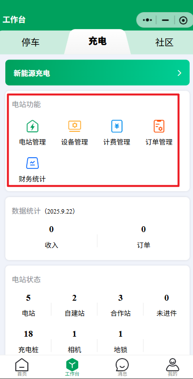 ### 1、电站管理 - 可查看、编辑充电站信息,或删除电站  ### 2、设备管理 - 可管理停车场下所有充电站的所有设备(充电桩、相机、地锁、监控)  - 也可在下方添加设备  - 点击设备可编辑或删除已有设备  ### 3、计费管理 - 查看、编辑、删除或增加计费标准  ### 4、订单管理 - 可查看充电、占位、预约、减免的订单  ### 5、财务统计 - 可按日、月、年的维度统计电站收入