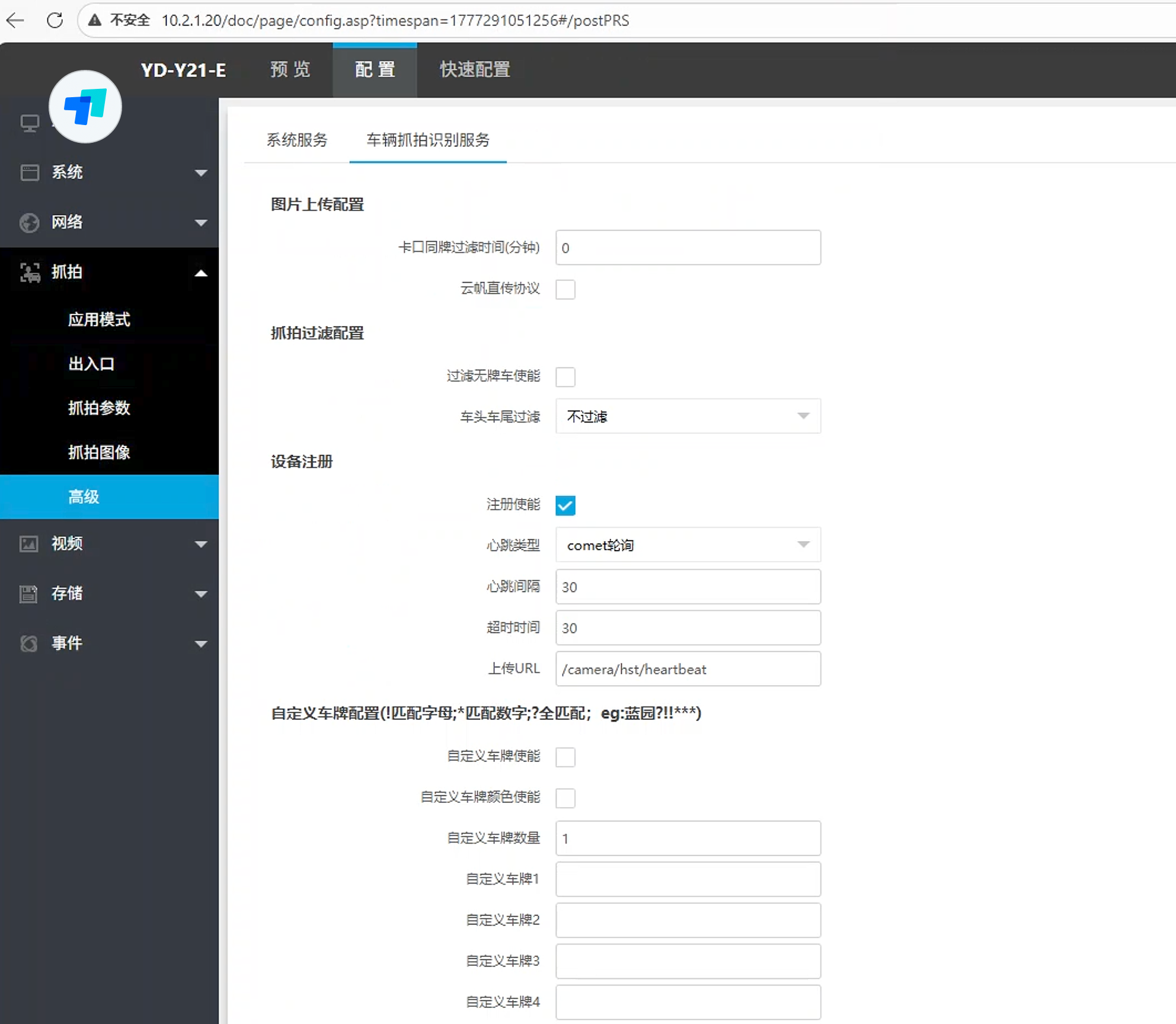 **启用ISAPI监听** 主机域名 ```xml iot.parkingos.club ``` 主机端口 ```xml 80 ``` 主机URL ```xml /camera/hst/plateResult ```  **设备注册** 心跳类型:comet轮询 上传URL ```xml /camera/hst/heartbeat ```